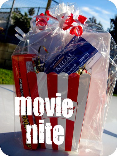 A 5 dollar Blockbuster gift card + Popcorn bucket from Dollar store, some homemade Redhots Popcorn, candy, and soda = $10